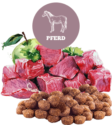Frisches Pferdefleisch, -herz, -leber, -lunge (40%), Erbsenmehl, Amaranth (13,2%), getrocknetes Pferdefleisch (13%), Apfel, Lachsöl (3,5%), Krill (3,5%), Chiasamen, Mineralstoffe, Leinsamen, Distelöl, Karotten, Zucchini, Bockshornklee, Löwenzahn, Flohsamen, Spinat, Rosmarin (0,1%)